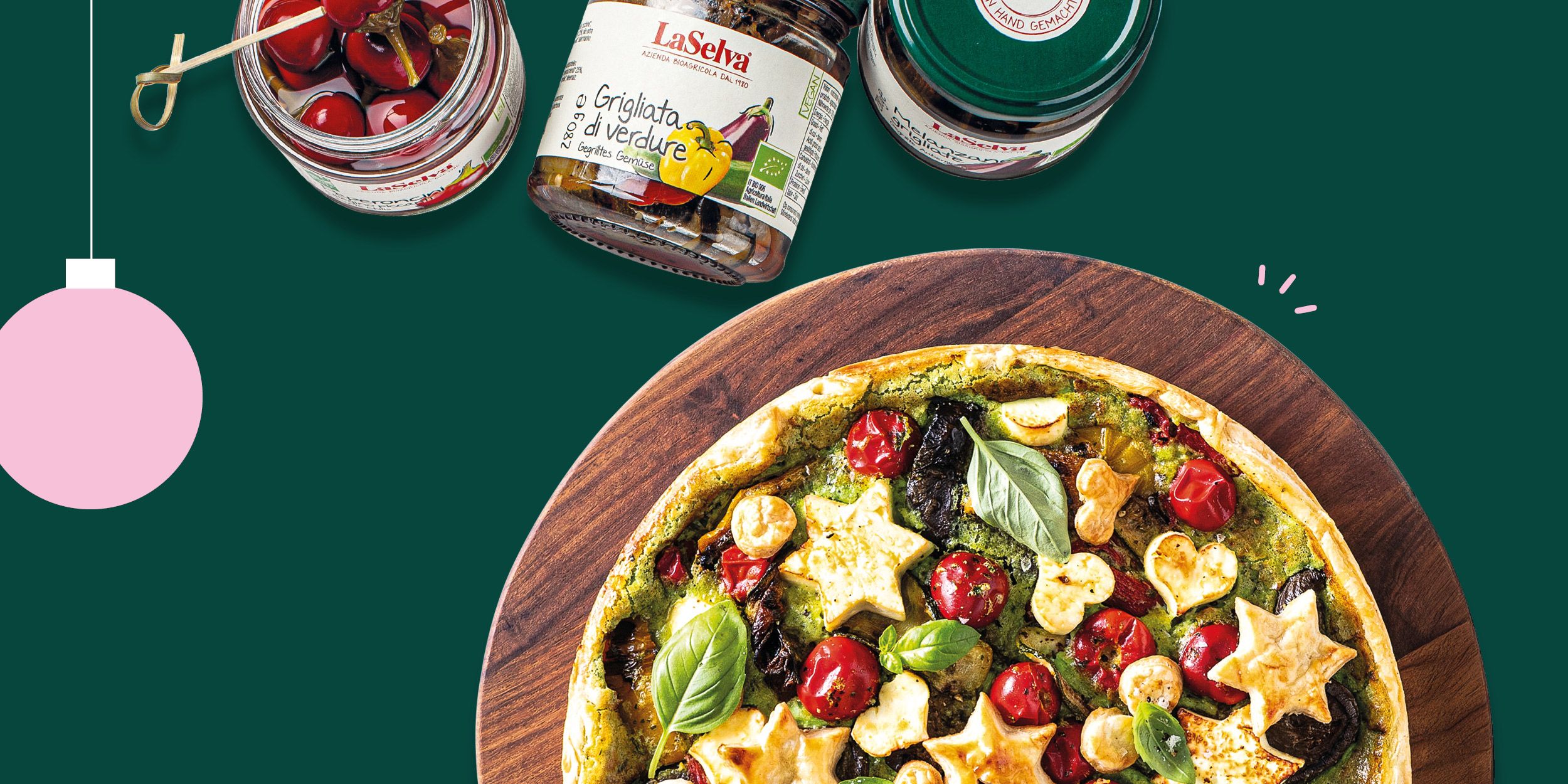 und Auberginen aufbewahren. Antipasti nach Belieben auf dem Teigboden verteilen. - Den Hirtenkäseblock in der Höhe in 2 Scheiben teilen, dekorativ ausstechen oder -schneiden (z.B. Sterne, Herzen, Kreise oder Dreiecke) und auf dem Gemüse verteilen.