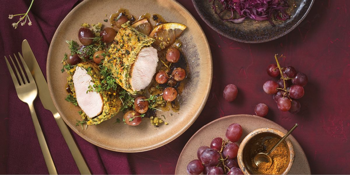 - Rotkohl und Trauben auf Tellern anrichten. Fleisch mit einem scharfen Messer vorsichtig in Scheiben schneiden und dazu servieren. Guten Appetit
