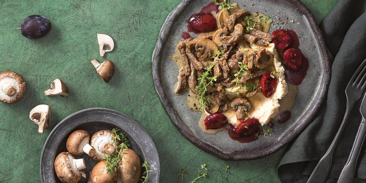 - Püree auf Tellern anrichten, Geschnetzeltes darüber geben