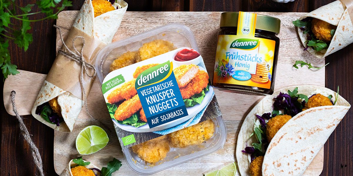 - Die Wraps mit Frischkäsesauce bestreichen. Mit Rotkohl und Rucola belegen und anschließend je 3 Knuspernuggets darauf geben.