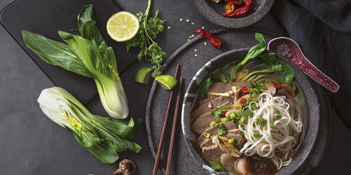 - Knoblauch, gehackten Koriander, Sternanis, Zimt und Kardamom kurz mitrösten. Mit der Brühe aufgießen und 30 Minuten köcheln lassen. Mit Zucker, Sojasauce und Salz würzen.