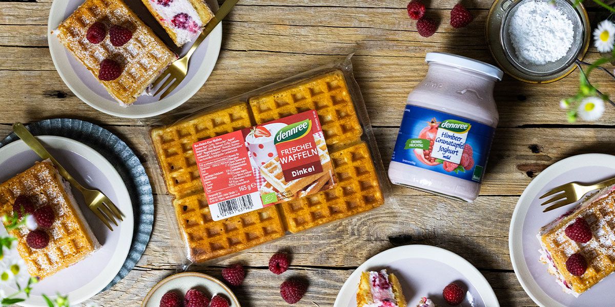 - Acht Waffeln auf eine Kuchenplatte legen und einen Tortenrahmen darum spannen.