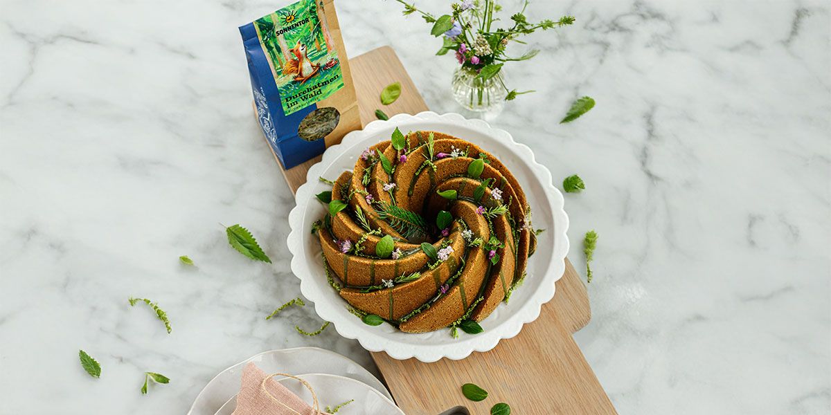 Glasur & Deko: Staubzucker mit dem restlichen Püree verrühren und über den vollständig abgekühlten Gugelhupf geben. Nach Wunsch mit Kräutern, Blüten oder Brennnesselsamen dekorieren.